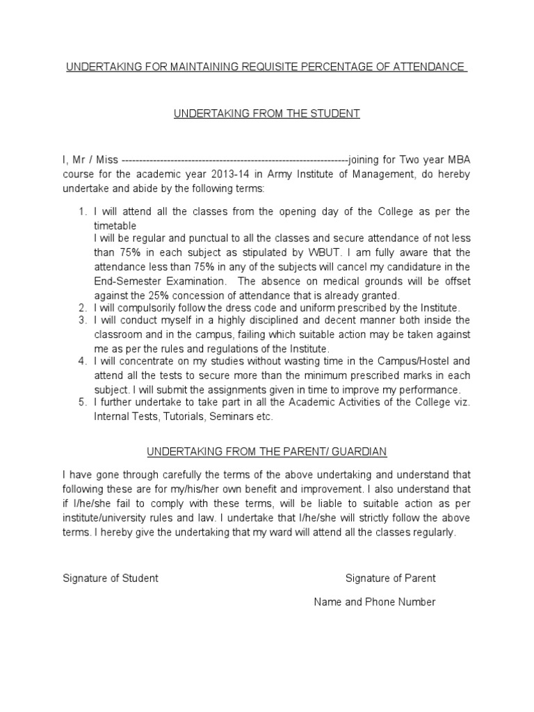 Attendance undertaking format. I promise that I will cover up my attendance in the next coming session _____ Semester year. 7 October 2017. ___ years Ro _____ Permanent address to be mentioned pursuant to my selection appointment as _____ at _____Unit do hereby execute this Bond Memorandum of Undertaking hereinafter referred to as MOU for convenience in favor of Ms _____ hereinafter referred to as Company for convenience and agree and hereby giving my full.